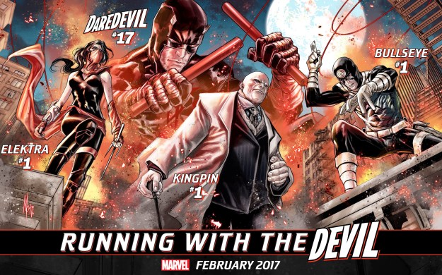 The table is set and the pieces are on the board. As Elektra, Kingpin and Bullseye set off on their own paths, how long before all three come crashing back in to Matt Murdock’s life? This February, take a walk on the dark side when you’re Running With the Devil! For more information on Running With The Devil, visit Marvel.com.
