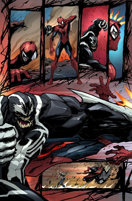 Reunited and it feels so good! That’s right, True Believer, Eddie Brock has reunited with the symbiote at long last! Today, Marvel is pleased to present your first look inside VENOM #6 – the next senses shattering issue from creators Mike Costa and Gerardo Sandoval! It’s a battle for the ages as new Venom host Lee Price throws down with your friendly neighborhood Spider-Man! But amid the chaos and the fury of battle, a familiar face returns! That’s right, Eddie Brock is back to reclaim his rightful place as the one-and-only Venom! Can symbiote and host coexist as they once did? With Eddie Brock back on the board, what will become of Lee Price? And seeds sown here bear bitter fruit in May’s oversized Venom #150. The fireworks begin on April 19th in the can’t-miss VENOM #6!