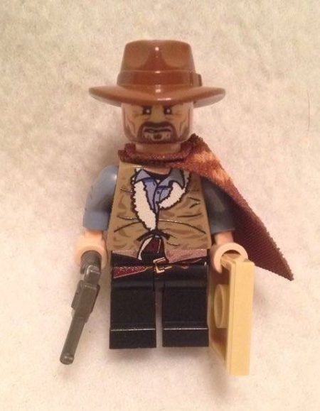 I will take a look at the individual minifigures, going in the order of their billing in the title. So, up first is “The Good”, The Man With No Name, or as Tuco calls him, “Blondie”, who was played by Clint Eastwood in the film. I am so glad they went with the looks the figures had at the end of the movie, because that means we get The Good with a poncho, which is my favorite look for this character, and has been really my favorite look for Eastwood from any of his movies, from a very young age. The printing on this figure (as well as the other two from this set), is very detailed, and is among the most detailed of the figures I’ve reviewed from Minifigures.com. From all the lines on his face, to all of the wrinkles on his vest, it looks amazing.