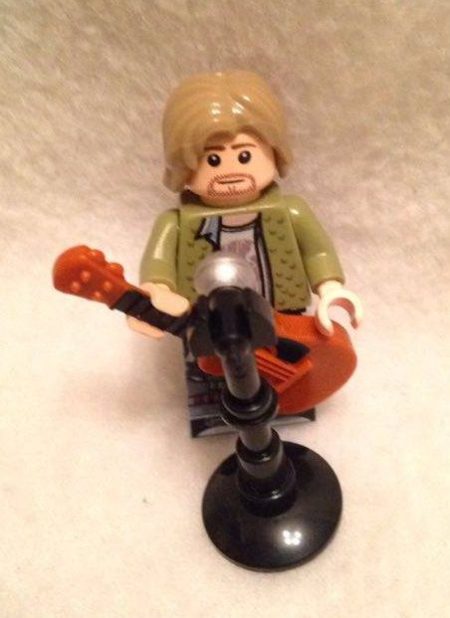 Grunge Icon Kurt Cobain comes with a guitar and a microphone. I believe the hair piece he comes with a stock Lego piece, but is a perfect fit for this minifigure. The face is a good match for a minifigure version of Kurt Cobain.