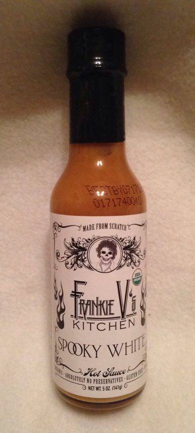 The next bottle is 5 oz of Frankie V’s Spooky White Hot Sauce. I really like the label on this one, kind of reminds me of old timey medicine bottles. The heat level for this one is listed as being hot, but it really kind of treads the line between medium and hot. The flavor is pretty good although a little oniony, and the vinegar is a little too present. I really liked using this on my hot dogs the most.