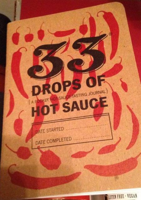 Resting on top of the bottles of hot sauce were a card that contained info about the sauces in the box, and a 33 Drops Of Hot Sauce Pocket Hot Sauce tasting journal. A copy of this journal is included in the first Fuego Box a subscriber receives. Inside, each page has a space for you to write the name and notes for every hot sauce you try, as well as a little square to put a drop of the described hot sauce in. Also, cool little note, each of these journals is made from recycled paper, and the ink contains a little hot sauce.