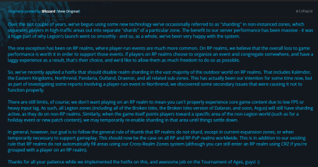 Tendael, “Tournament of Ages was one of the most successful events I’ve ever had the pleasure of working on, but we’re still held back by the limitations of the game. One problem we’ve wrestled with since the beginning was communicating across factions. You have hundreds of people mingling in one location, but no way to talk to the other faction unless you have them on your friend list or find them over Discord. It’s very annoying, and it’s a problem we deal with for any large server event. It sounds like every time we do an event like this, I hear both sides wishing for the same thing: cross faction communication. The desire for this feature is overwhelming. Just look at the thread – over 300 upvotes in 3 days. I saw a thread that got 250 upvotes in 3 months. The RP community is making it very plainly clear to Blizzard that they want to talk to the other faction. I just hope that they acknowledge our message here in the same way they acknowledged our message about sharding”