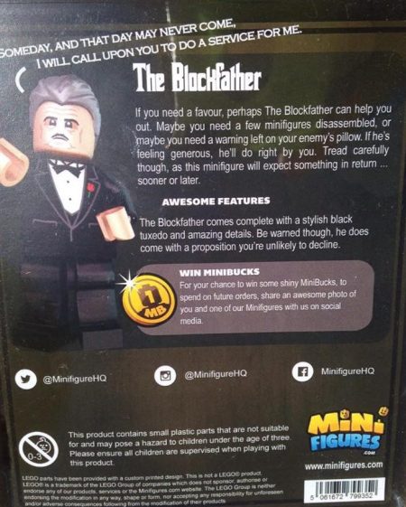 Today, I am taking a look at Minifigures.com’s The Blockfather minifigure. The figure is obviously modeled after The Don Vito Corleone from Part One and Part Two of Francis Ford Coppola’s The Godfather Trilogy, played by Marlon Brando. It comes in the great, resealable packaging that Minifigures.com uses. I love the packaging, because you can take the minifigure out and play with it, or use it for displays, but then put it back in to display it in the packaging. So you CAN have your cake and eat it too.