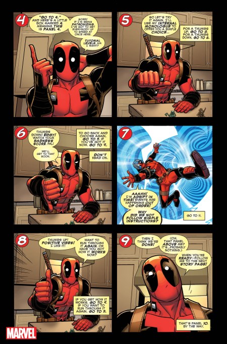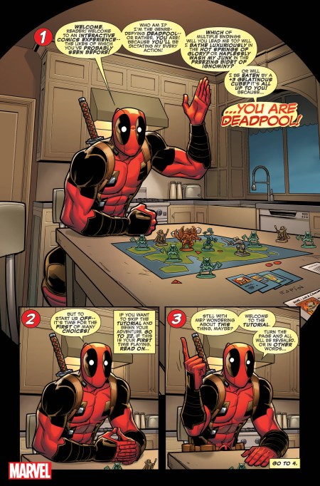 “YOU ARE DEADPOOL is a five-part adventure gamebook in the classic tradition of FIGHTING FANTASY, LONE WOLF and DICEMAN — where YOU, and the cut-out-and-keep DEADPOOL DIE, control the action! Every week brings a COMPLETE single-player adventure — where you encounter glamorous guest-stars like HULK, GHOST RIDER, GRASSHOPPER, DAREDEVIL and ANOTHER GRASSHOPPER — that form an EPIC QUEST the like of which you’ve NEVER SEEN, unless you have!” teases series writer Al Ewing. “And there’s more! Fight END-OF-LEVEL BOSSES! Manage your inventory by STEALING background objects! Explore FIVE DIFFERENT TIME ZONES in NEARLY ANY ORDER! Play the TUTORIAL LEVEL! Enjoy UNIQUE MINIGAMES about BAR FIGHTS, BEAT POETRY and SNEAKING THROUGH LEVELS! LAUGH! CRY! CHEAT! It’s all waiting for YOU — because YOU ARE DEADPOOL!”