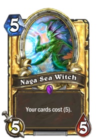 JamieFTW: Naga Sea Witch is a card that was released in the League of Explorers adventure. It saw very fringe play in fun decks because it did exactly what the card text says “Your cards cost (5)”. This means that if you played it on turn 5 (or 4 with the coin) and your opponent didn’t kill it, you could play a 6, 7, 8, 9, or 10 Mana card for 5 Mana on your next turn. So it was kind of like Spiteful Summoner, but with no deck building requirement on big spells and you didn’t get a big minion for free on the same turn. Then, in August 2017 a patch was released which contained a change to the behaviour of Naga Sea Witch. For cards whose text reduced their cost, these cost reductions take effect AFTER the Naga Sea Witch cost reduction. So for example, if you have a 10 Mana giant in your hand that costs 1 Mana less for every card your opponent is holding, once Naga Sea Witch hits the board the giant’s cost is reduced from 10 to 5, and then from 5 to 0 if your opponent is holding 5 or more cards. The outcome of all of this is you can play Naga Sea Witch (a 5/5 minion) and 1 or more giants (8/8 minions) – and it’s not uncommon to see 3 or 4 giants – on turn 5. If you aren’t playing a class that can clear the board on turn 5 or you are playing a class that can clear the board but you don’t have it in your hand, you just pretty much lose the game right there. Not very fun.