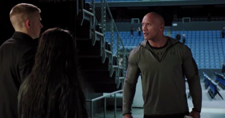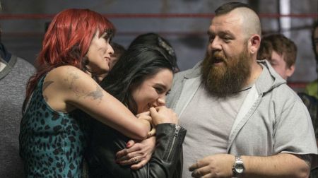 Best known for comedies like the UK version of The Office with Ricky Gervais, I asked him if he was surprised by the comedic personalities wrestlers can have. “I had underestimated it beforehand. My admiration has gone up. There’s a lot of wit, there’s a lot of humor. I’ve met a lot of people who work behind the scenes and they are very smart. You find the most unlikely people who have worked or are fans of wrestling. Dwayne is really funny. That promo he does on the kids where he sort of trash talks them in the corridor, I had written a bad imitation ripped from the web, all his funniest lines. He looks at me, goes to a corner, comes back tells me to get the camera running and just does it. The rhythm, the shape of it, the build up, it’s a skill I couldn’t do. Florence at the end doing her promo, he helped her with that. We took what Paige said for real from that match and other matches, but we wanted Florence to own it for herself. It was important that she was feeling it out there. It’s a testament to her that you can feel her emotion.”