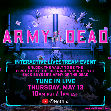On Thursday, May 13th, Netflix will host a global livestream event only on the Netflix YouTube channel. Fans can tune-in live for this interactive experience to be part of unlocking the first 15 Minutes of Zack Snyder’s eagerly-anticipated Netflix Film, Army of The Dead.