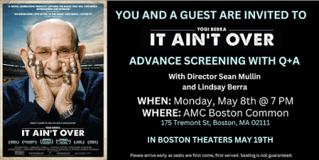 You are invited to attend the advance screening of Sony Pictures Classics’ IT AIN’T OVER on Monday, May 8th at 7:00 PM at AMC Boston Common immediately followed by a Q+A with Director Sean Mullin and Lindsay Berra (granddaughter of Yogi Berra).