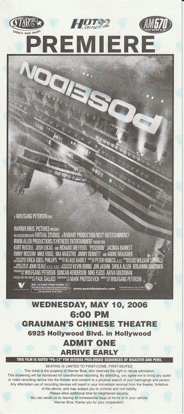 I first saw Poseidon May 10, 2006. How do I remember that oddly specific date? I went to its premiere at Grauman’s Chinese Theatre with all the stars (check out the ticket below). Once I got the 4K to review I realized I hadn’t seen it since then and popped it in. You can tell they honestly thought they made something big back then. Was it going to be the next Titanic? Was it going to be as popular as The Poseidon Adventure from 1972? Unfortunately it was neither and rewatching it on 4K I remembered why.